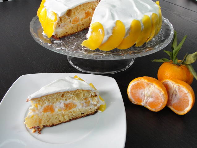 Bata as natas com 5 colheres de açúcar e reserve uma chávena de chantily para a cobertura. Junte o pêssego cortado em cubos (reserve duas metades de pêssego para a decoração) e os gomos sem pele de 2 tangerinas.