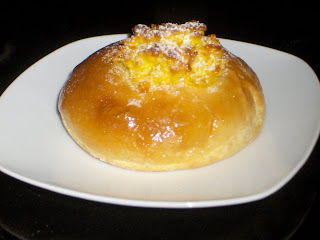Espalhe o doce de ovos na massa, cubra com as frutas cristalizadas e as amêndoas moídas.Enrole a massa tipo torta, a partir do lado maior e, com uma faca, corte em 12 rolinhos. Disponha os rolinhos numa forma untada com margarina e polvilhada com farinha, cubra-a e deixe crescer em um local quente até dobrar de tamanho, por 30 minutos. Leve a cozer ao forno, pré-aquecido, cerca de 20 a 25 minutos, até dourar. Quando retirar do forno pincele com geleia.