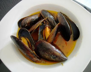 Num tacho, fazer refogado com os alhos, cebola picada, coentros, azeite e polpa de tomate. Colocar os mexilhões, o vinho branco e o sal, tapar o tacho e deixar ferver até que os mexilhões abram. Deixar apurar o molho.